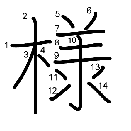 Hlavný radikál: 木 (75) Ťahy: 14 obrázok (png) | animácie (svg) | tabuľka (svg)