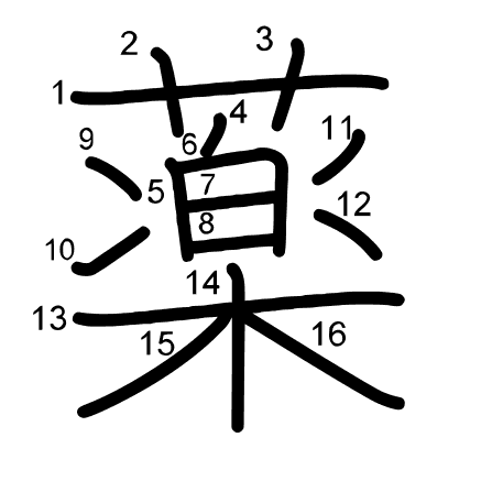 Hlavný radikál: 艸 (140) Ťahy: 16 obrázok (png) | animácie (svg) | tabuľka (svg)