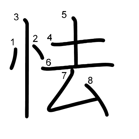 Hlavní radikál: 心 (61) Tahy: 8 obrázek | animace | tabulka