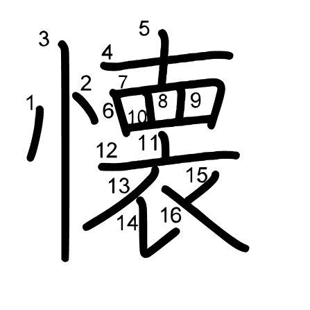 Hlavní radikál: 心 (61) Tahy: 16 obrázek | animace | tabulka