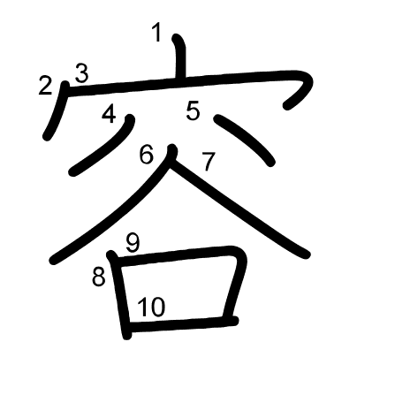 Hlavní radikál: 宀 (40) Tahy: 10 obrázek | animace | tabulka