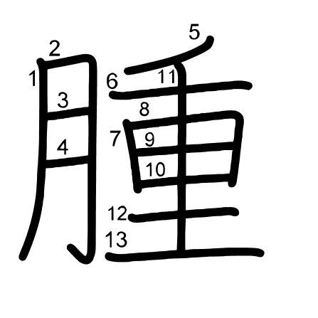 Hlavní radikál: 肉 (130) Tahy: 13 obrázek | animace | tabulka