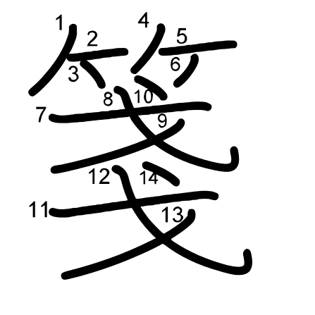 Hlavný radikál: 竹 (118) Ťahy: 14 obrázok (png) | animácie (svg) | tabuľka (svg)