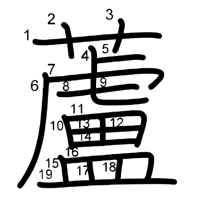 Hlavný radikál: 艸 (140) Ťahy: 19 obrázok (png) | animácie (svg) | tabuľka (svg)