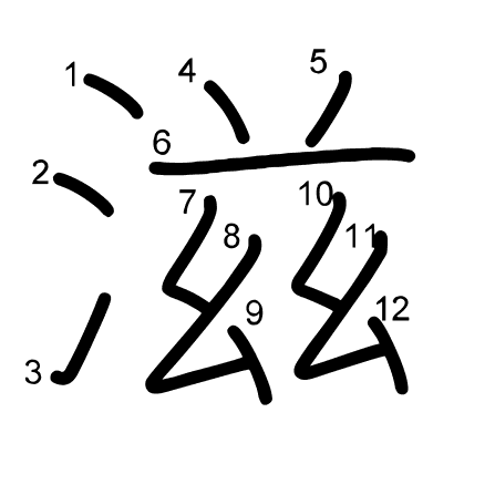 Hlavný radikál: 水 (85) Ťahy: 12 obrázok (png) | animácie (svg) | tabuľka (svg)