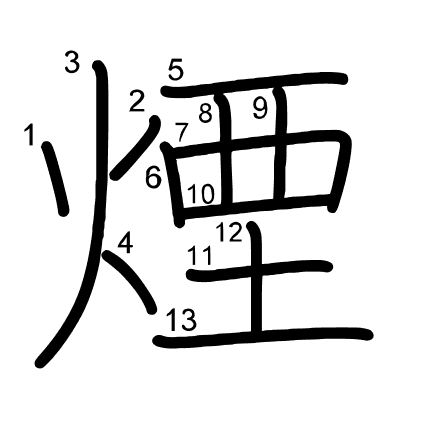 Hlavní radikál: 火 (86) Tahy: 13 obrázek | animace | tabulka
