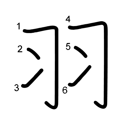Hlavní radikál: 羽 (124) Tahy: 6 obrázek | animace | tabulka